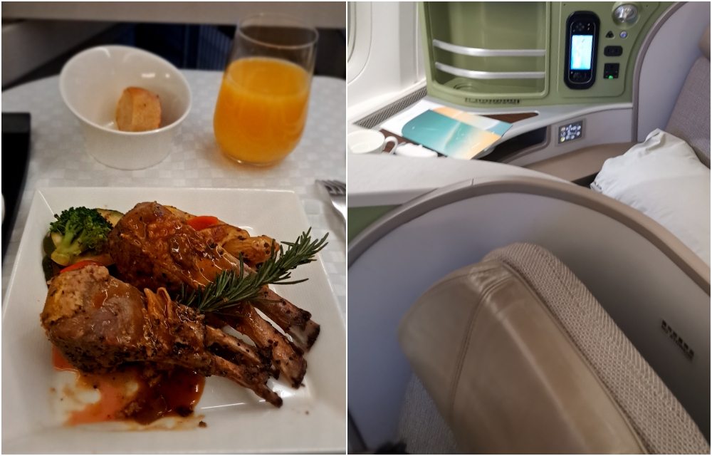 我叫老公傳照片過來,結果人家商務艙吃羊排啦!這才是真的羊排啦!想起那個國泰嚇壞我和阿姊的羊排(呼~)